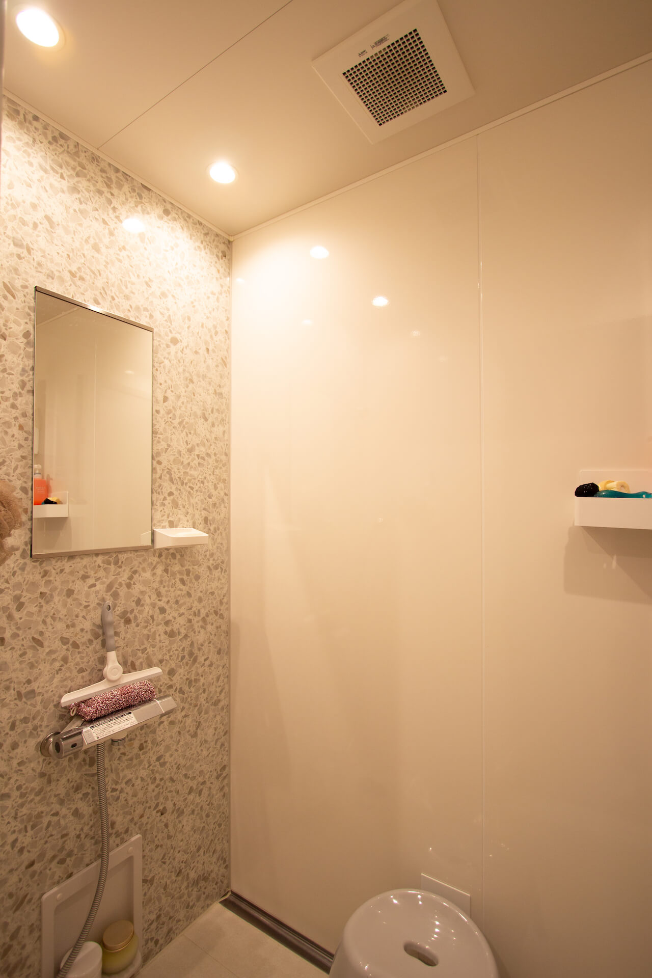 1Fにはお風呂。2Fにはシャワールームを設置。