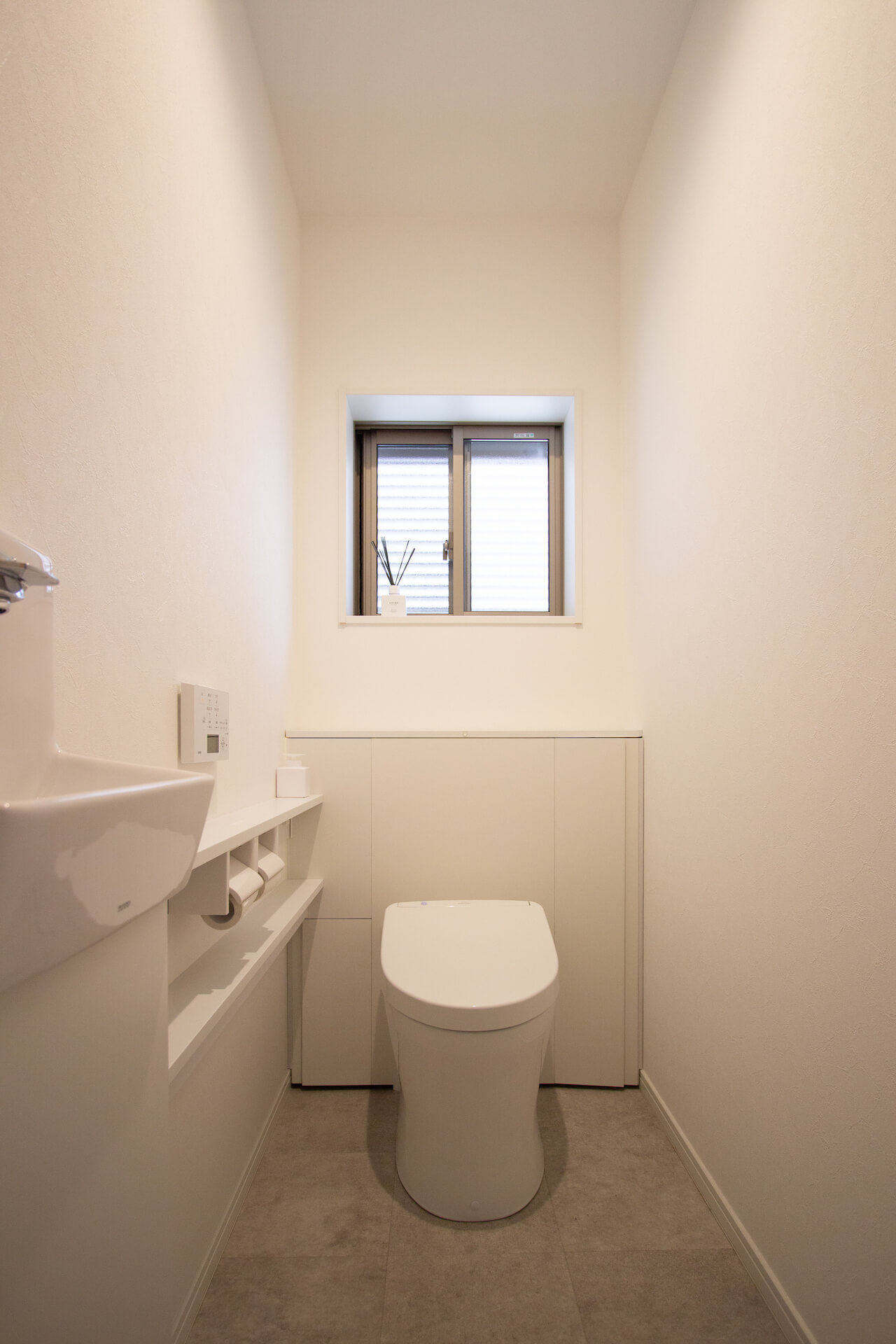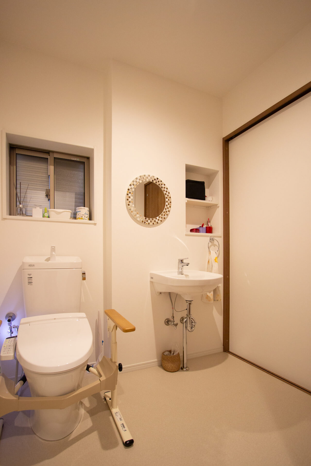 1Fのトイレはバリアフリーで車いす対応。洗顔もできるように高さを調節。