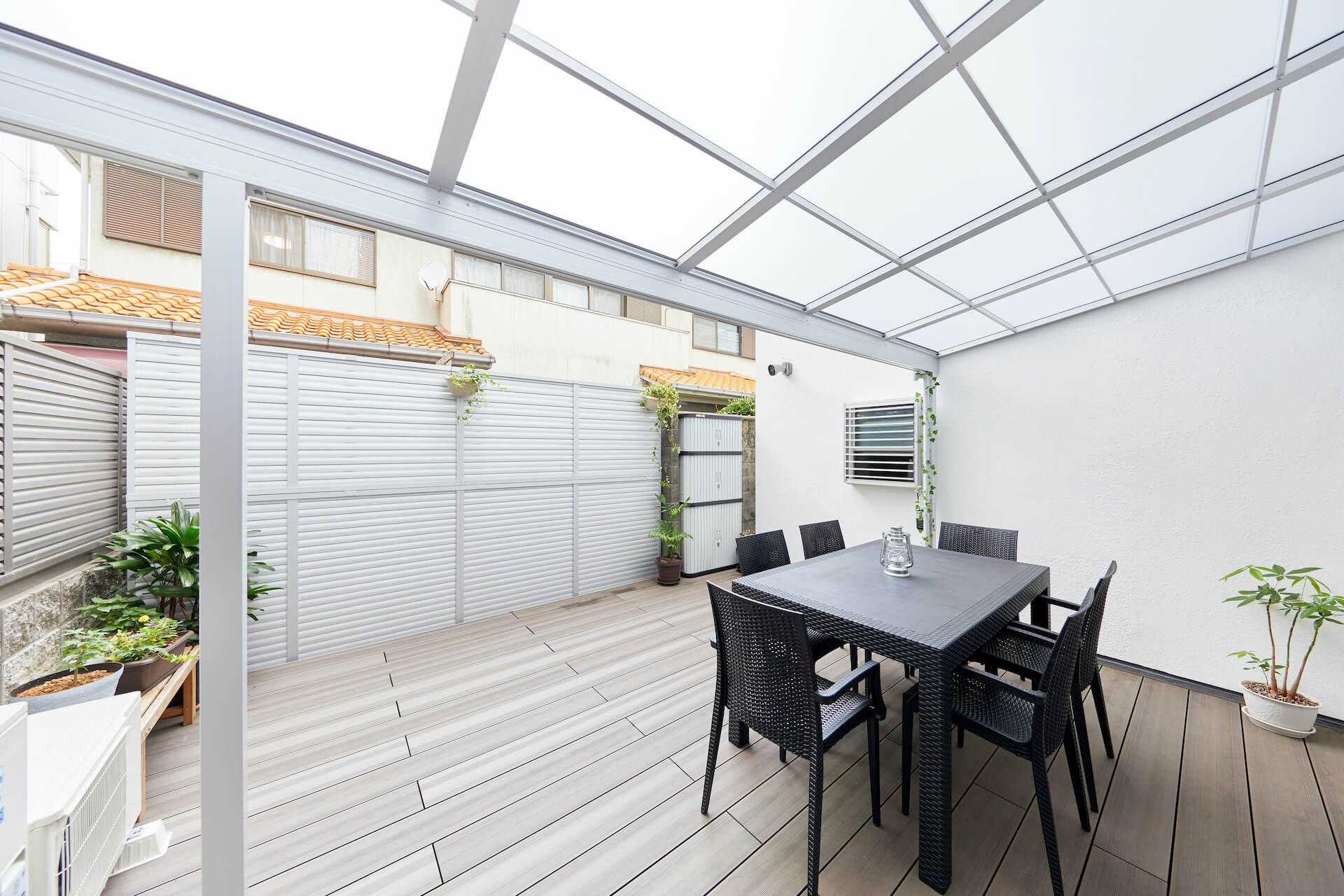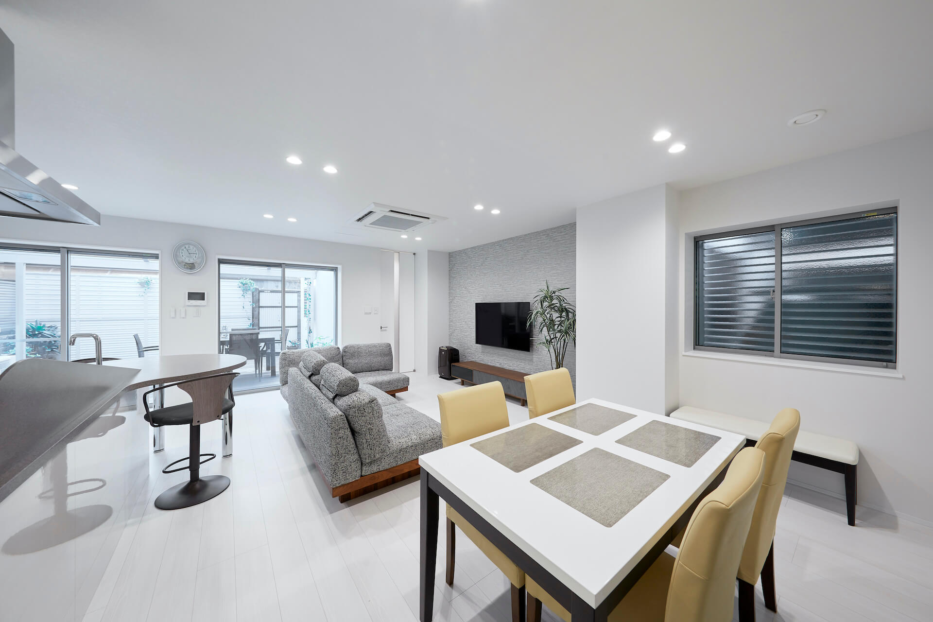 →第一種換気を取り入れました。気密測定をして数字が基準をクリアするまで何度も気密性をアップさせる施工を繰り返しました。また、吹き付け断熱で断熱性もアップさせています。外からの暑さ・寒さを軽減し、快適な温度でフレッシュな空気環境を整えることで住み心地いい住空間に仕上げました。屋上バルコニーやウッドデッキなどには防水対策もしっかり施し、メンテナンスができるだけラクな素材を使用。さらにタイルやエコカラットなどを提案し、ラグジュアリーな空間が完成しました。