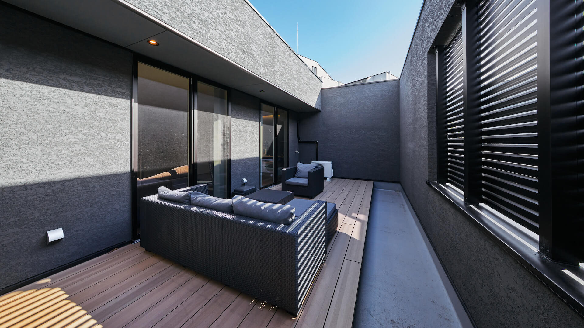 リビングと和室の外側をつなぐ1階テラス、アウトドアリビングとして使える2階バルコニーなど、開放的なスペースも充実。チーク材のフロアや壁のタイル、珪藻土の壁や琉球畳の和室など、異なる素材をバランスよく組み合わせた内装です。一級建築士が手掛けたハイクオリティな住まいを確かめて下さい。