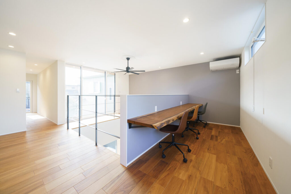 2階の吹き抜けに面したホールには一枚板のカウンターを設置。在宅ワークや趣味のスペースとしても活躍