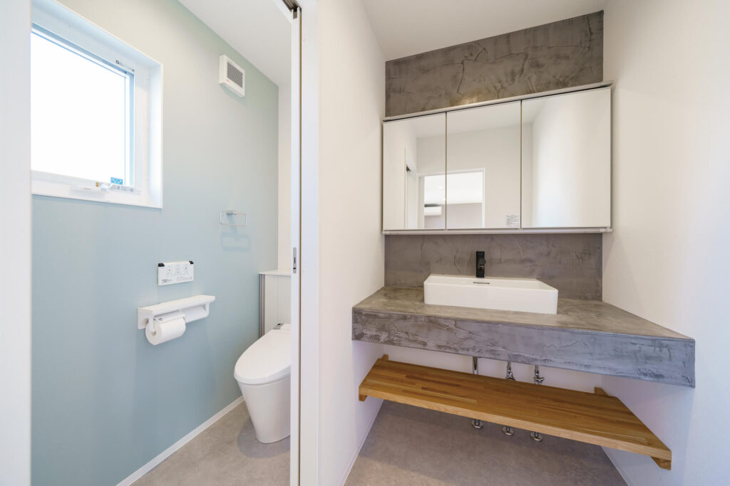 洗面台はオリジナルデザインで造作。モールテックスを使った四角のボウルがインダストリアルな雰囲気