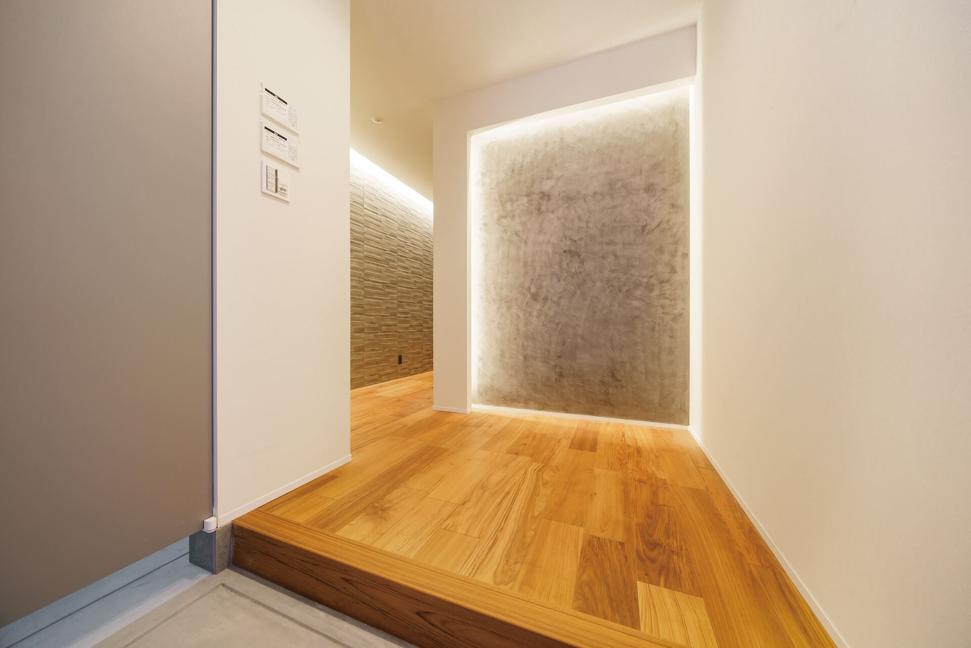 玄関ホールの廊下の床材にチーク材を使用。LDKに入った時に視覚的ギャップで広く感じる工夫を凝らしている