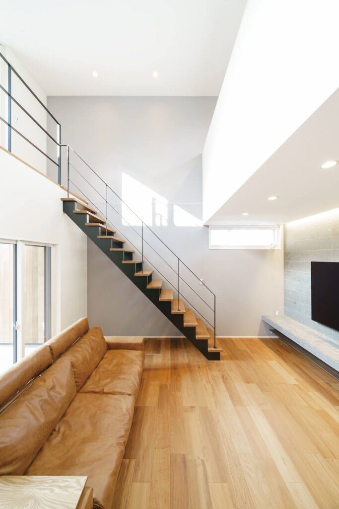 リビング階段の手すりは、光と目線をほどよく通すアイアン製。階段をのぼりながら家族とふれあえる