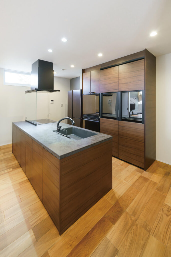 セラミックトップのアイランドキッチンは使い心地が抜群。リビングを一望しながら作業ができる