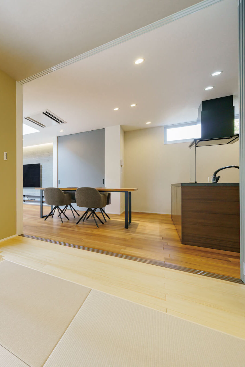 琉球畳を市松模様に配置した和室がリビングに隣接。周りをぐるりと囲った板間もお洒落